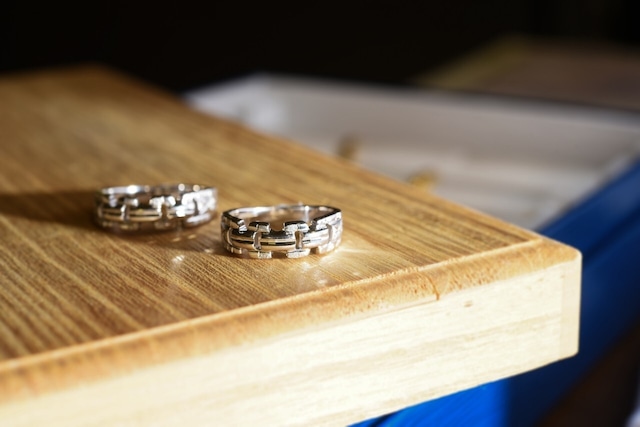 結婚指輪・ペアリング "《 輝彫・縁(えにし) 》 一期一会、おふたりが互いに奇跡的なご縁に恵まれて、 幸せな人生を歩むことの素晴らしさを 感じて頂きたいと願いを込めました。 しっかりと組み合わされた鎖のフォルムが おふたりの固い絆と 約束の契りを表しています。 《 スタッフおすすめポイント 》 個性的&重厚感のある しっかりとしたつくりのリングです! 結婚指輪だけではなく、記念リングにも おすすめのデザインです♪ K18でお作りすることも可能です。 ご希望の場合はお問い合わせくださいませ。 刻印は英大文字または数字(.やtoも可能)で15文字程度入れることが可能です。 ご希望の際は備考欄に記入をお願い致します。 ※サイズ直し初回無料。 ※ご注文いただきましてから約6週間での発送となります。 ————————— いいものをいつまでも 受け継ぐジュエリー ————————— 〒644-0011 和歌山県御坊市湯川町財部181 オークワロマンシティ1F しんえい ELFIN ・営業時間 9:00〜19:00 ・不定休 ————————— 商品のお問い合わせ、リフォーム修理、ご予約はお電話にて承っております。 ▷ 0738-23-0200 ————————— 当店は「いいものをいつまでも」を理念に和歌山県御坊市にて50年ジュエリーの販売をさせていただいております。 和歌山県で結婚指輪・婚約指輪・ジュエリーのことで何かお困りごと、ご相談ございましたらぜひご連絡、ご来店くださいませ。