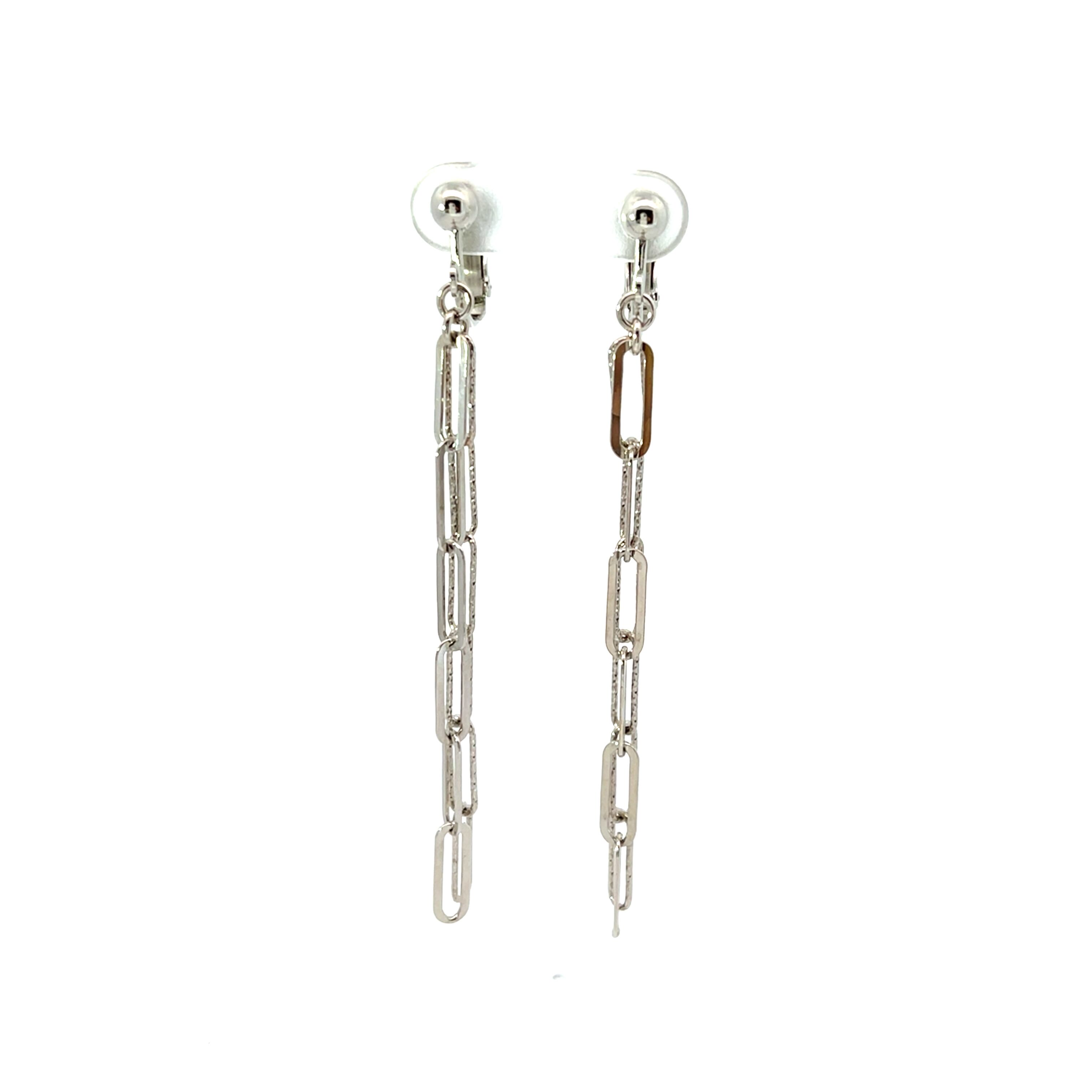 光を受けて美しく輝くシルバーの2連チェーンが、耳元で優雅に揺れ動き、シンプルながらも個性的な印象を与えます。どんなコーディネートにも合わせやすいデザインで、日常使いにも特別な日にも最適です。
